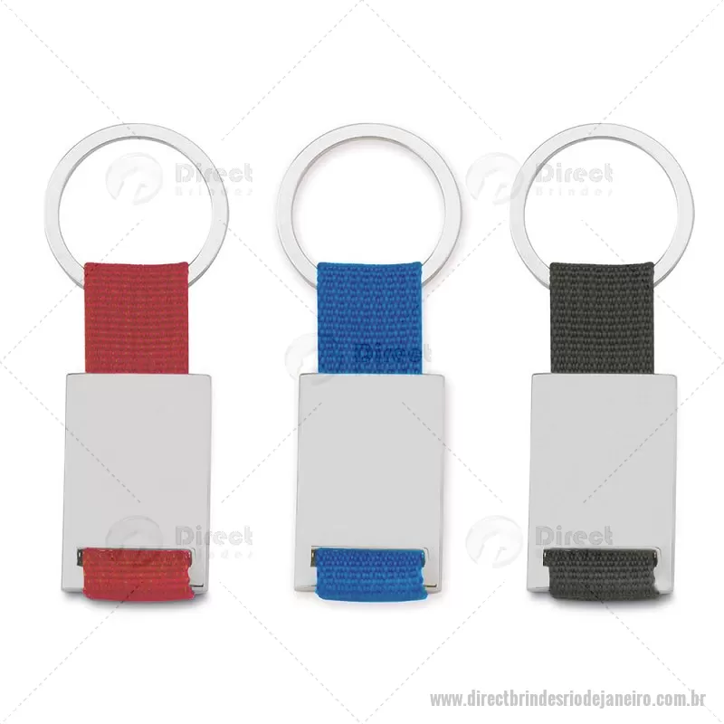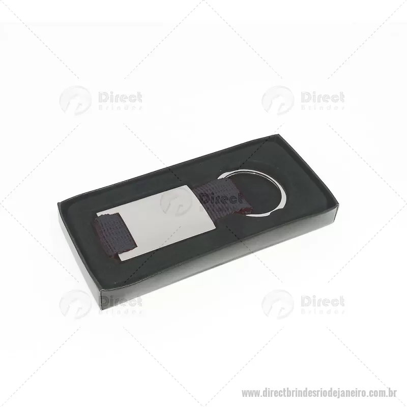 Chaveiro de metal retangular com detalhes em nylon + caixa com berço aveludado. Obs.: Frente e versão são iguais. Dimensão Produto: 8,5x3,4cm (AxL) Peso do Chaveiro: 0,025kg Peso do berço aveludado: 9g - - DRTJJCHV214