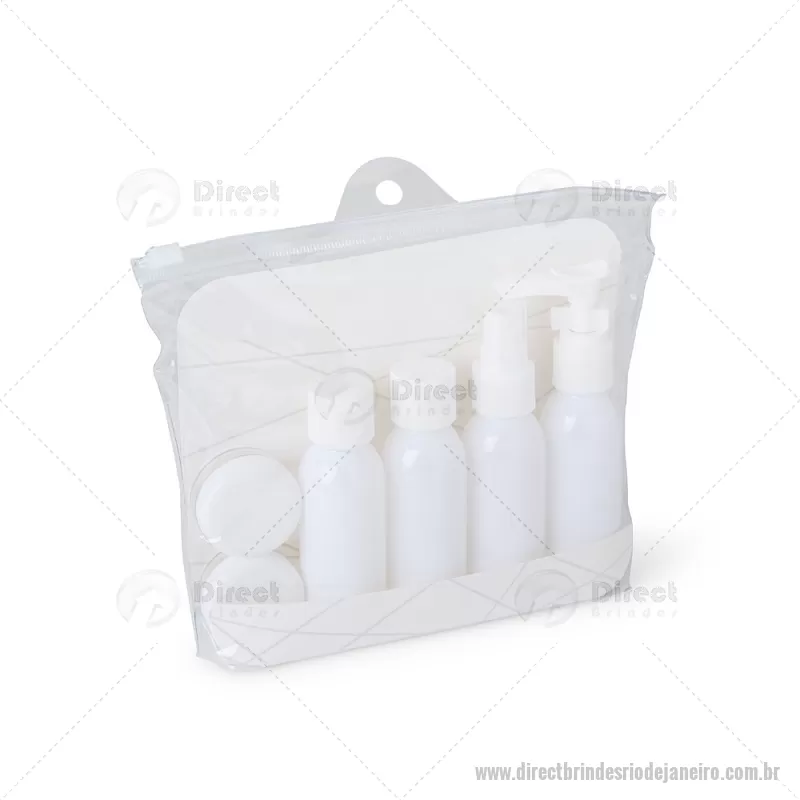 Kit Viagem Plástico 6 Peças Um kit para viagens que traz mais praticidade na hora de transportar itens de maquiagem e cuidados pessoais de maneira compacta. O conjunto, que vem em um estojo ziplock, conta com 1 frasco pump de 50ml, 1 frasco spray de 50ml, dois frascos com tampa rosqueável de 50ml e 2 potes de 5ml. Altura : 15 cm x Largura : 17 cm x Profundidade : 4 cm Peso aproximado (g): 83 - - DRTJJKVG015