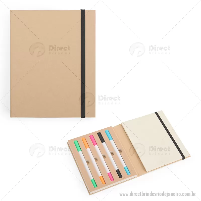 Bloco de anotações com capa dura em kraft e fechamento por elástico. Possui aproximadamente 80 folhas de tonalidade marfim sem pautas e cinco canetas coloridas de ponta dupla: uma fina e outra tipo pincel. Largura : 14,3 cm x Espessura : 2,3 cm x Comprimento : 18,1 cm Tamanho total aproximado (CxL): Caneta: 16,1 cm x 1 cm Peso aproximado (g): 247 - - DRTJJBLC280