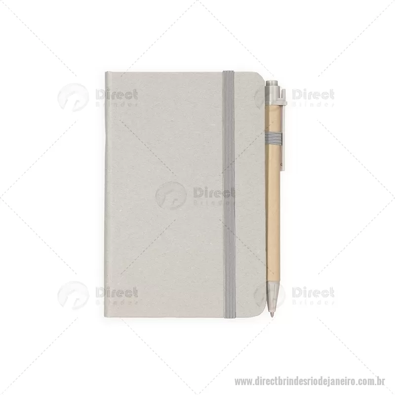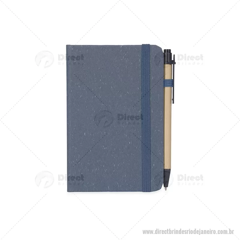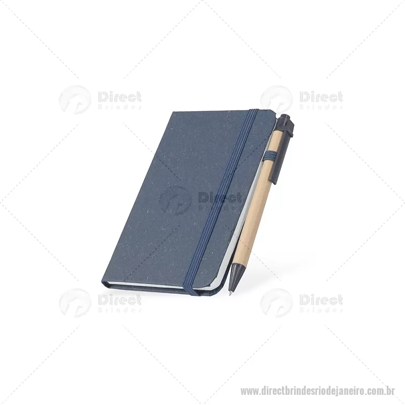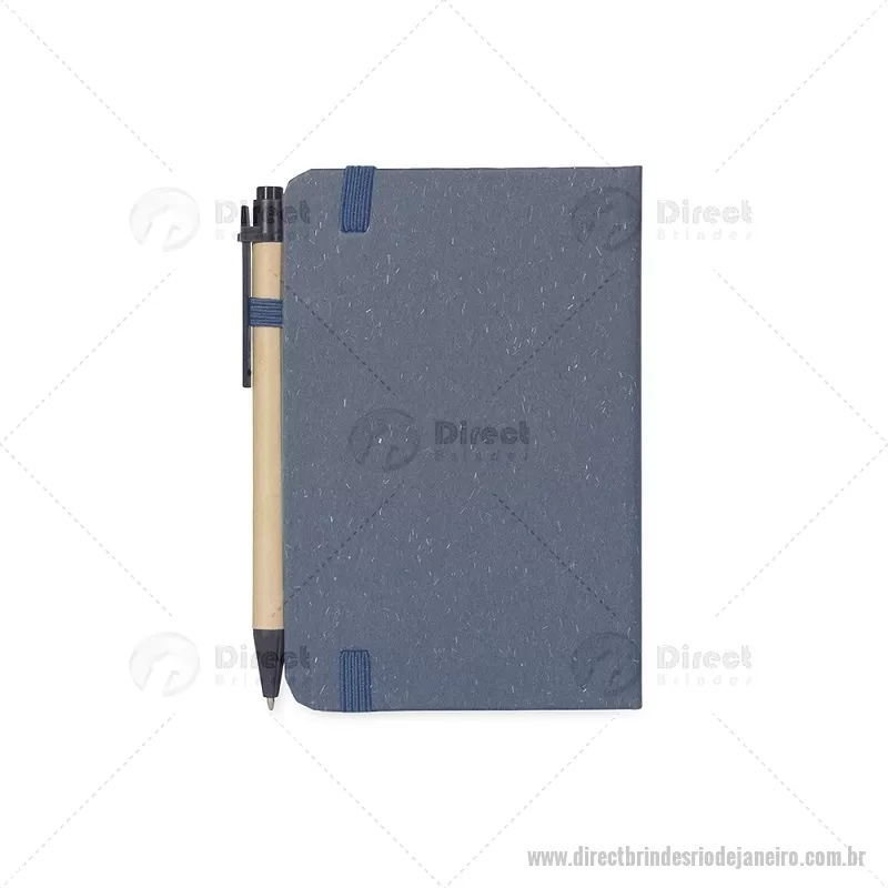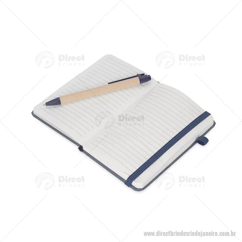 Caderneta ecológica com capa dura revestida em fibra de palha de trigo, contendo cerca de 80 folhas pautadas, duas folhas de guarda, elástico para fechamento e porta-canetas. Acompanha caneta esferográfica azul 1,0 mm com corpo em papelão, clip e acionamento por clique. - - DRTJJBLC270
