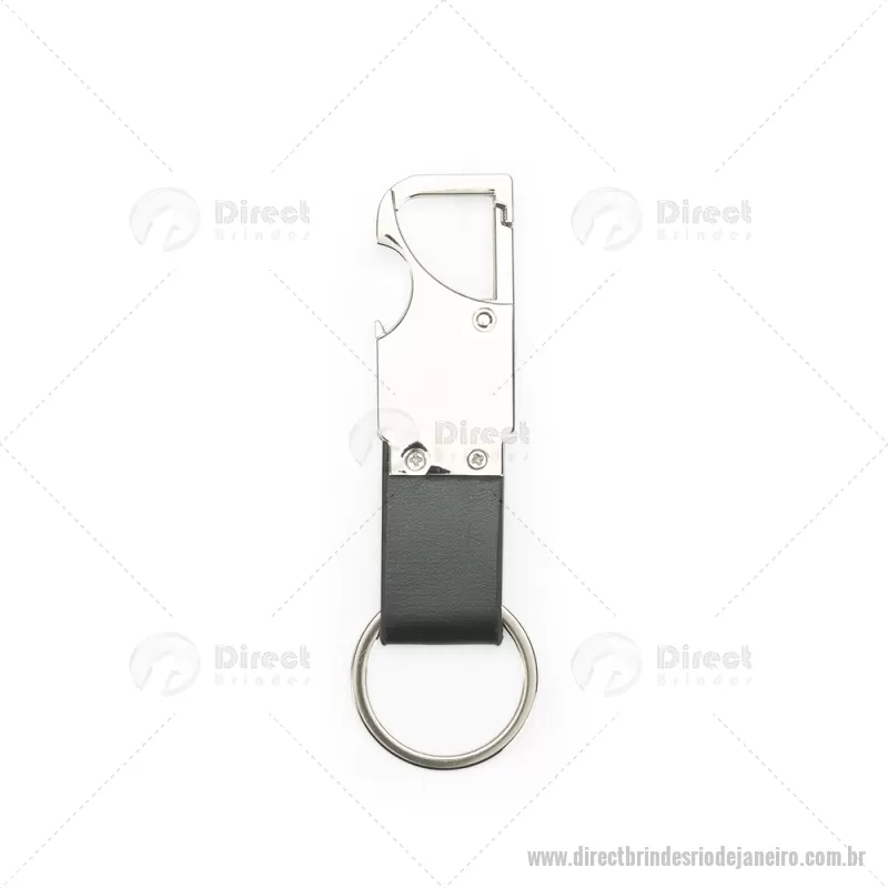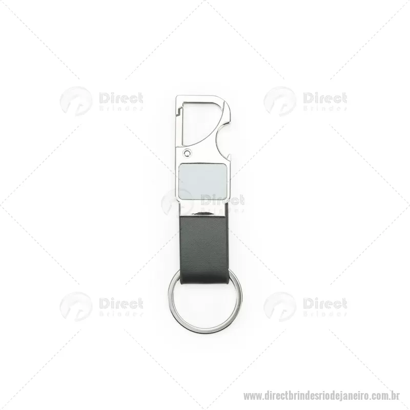 Chaveiro em metal com tira em couro sintético, equipado com mosquetão e função abridor de garrafas. Prático e funcional para o dia a dia. - - DRTJJCHV215