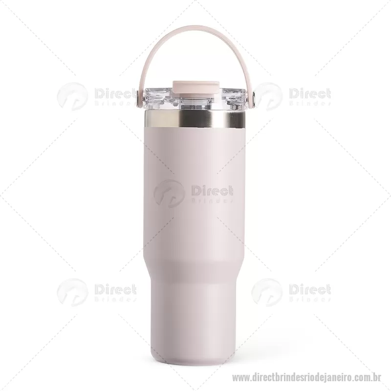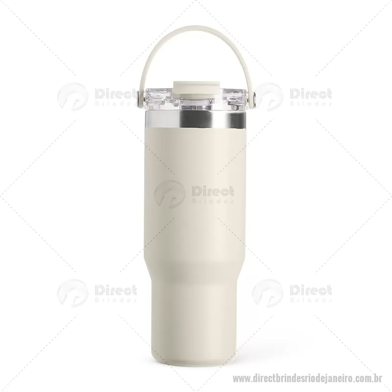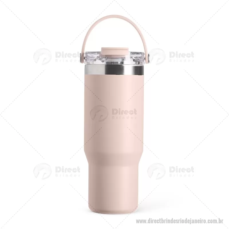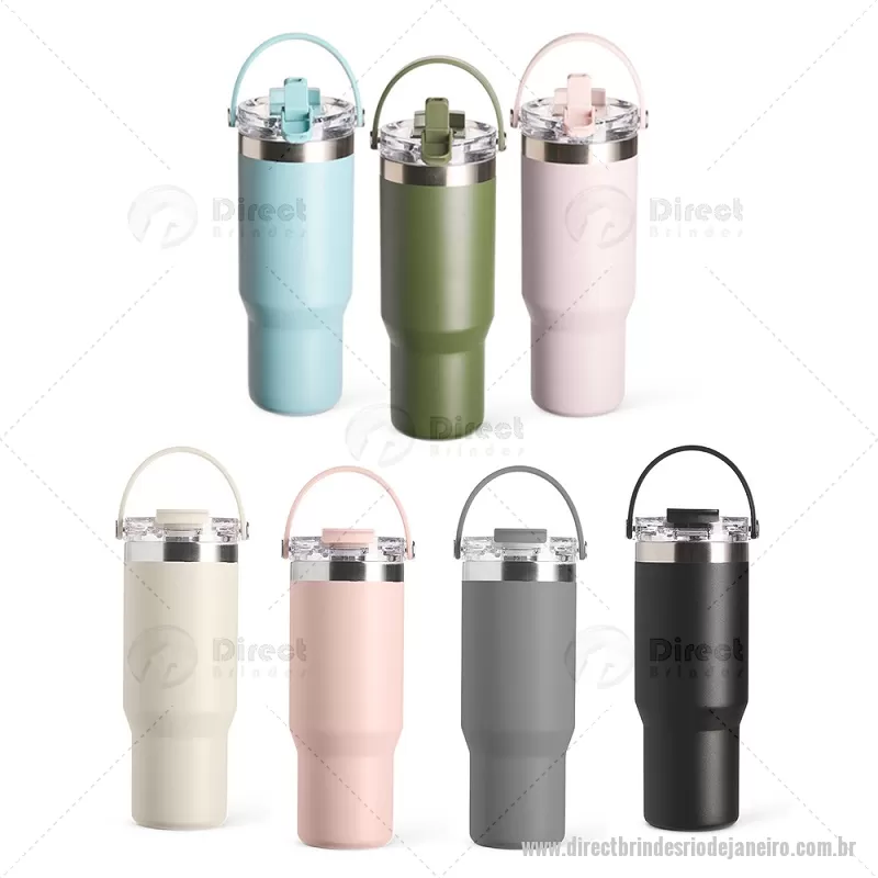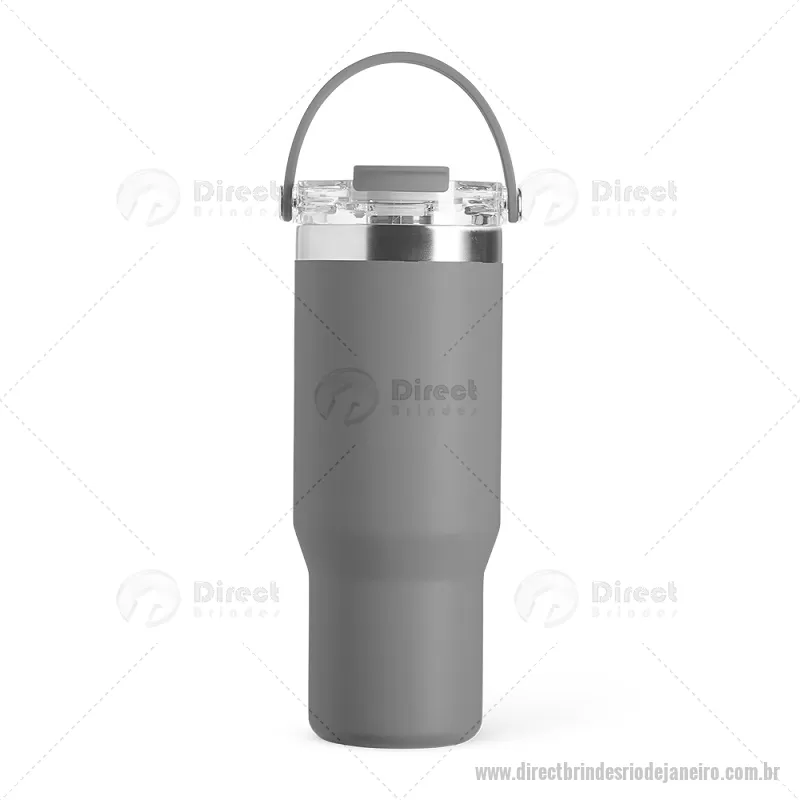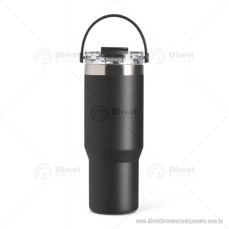 Copo térmico de 900 ml em aço inox com parede dupla, ideal para manter a temperatura de bebidas por mais tempo. Possui tampa plástica rosqueável com vedação a vácuo, proteção para o bocal, bico flip com canudo interno removível e alça para transporte. Conta com acabamento em pintura eletrostática, garantindo durabilidade e visual sofisticado. - - DRTJJCPO146
