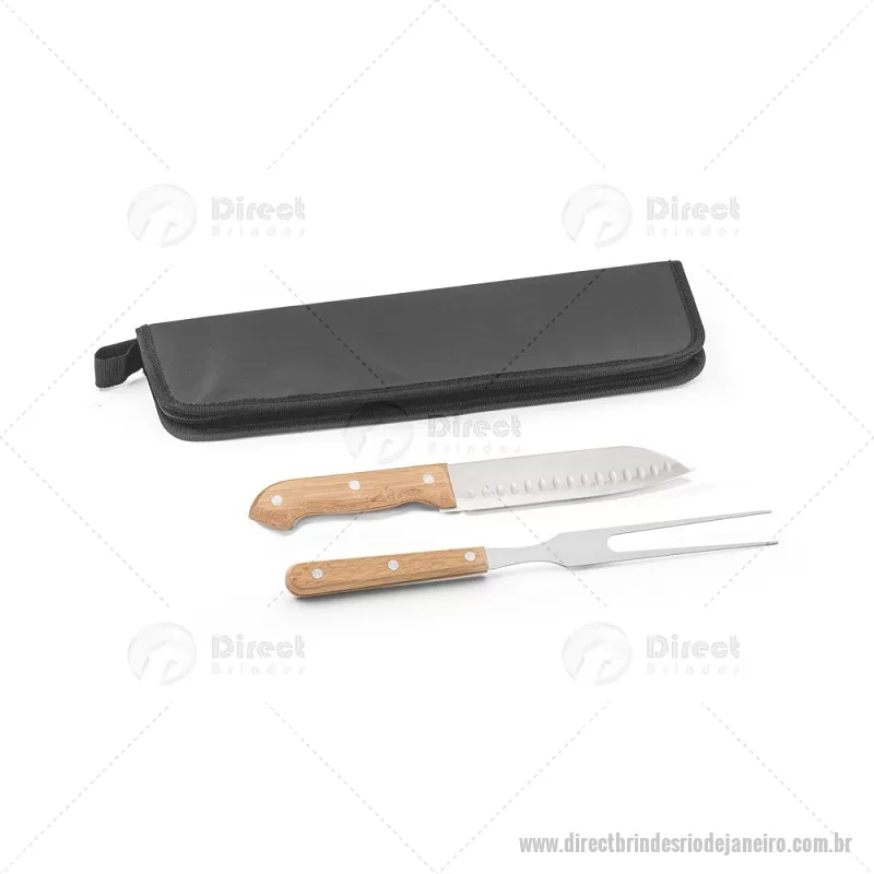 Kit churrasco com estojo em 210D. Composto por 2 utensílios em aço inox com cabos em madeira: garfo e faca japonesa. Certificação EU Food Grade. A cor e o resultado da impressão nos materiais naturais pode variar entre produtos. Garfo: 300 mm | Faca Japonesa: 285 mm | Dimensão da mala: 350x130x20mm - - DRTJJKCH092