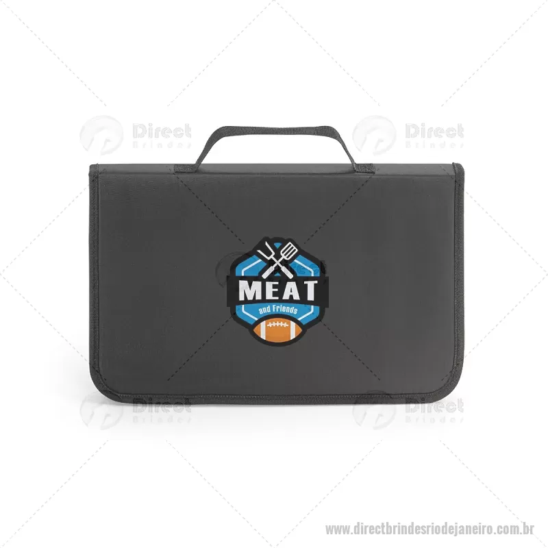 Kit churrasco em estojo de nylon 210D com tábua em PP e 5 utensílios em aço inox e PP: faca chefe, faca boning, faca pequena, garfo e afiador. Certificação EU Food Grade. Estojo: 350 x 230 x 40 mm | Tábua: 283 x 192 x 5 mm - - DRTJJKCH056