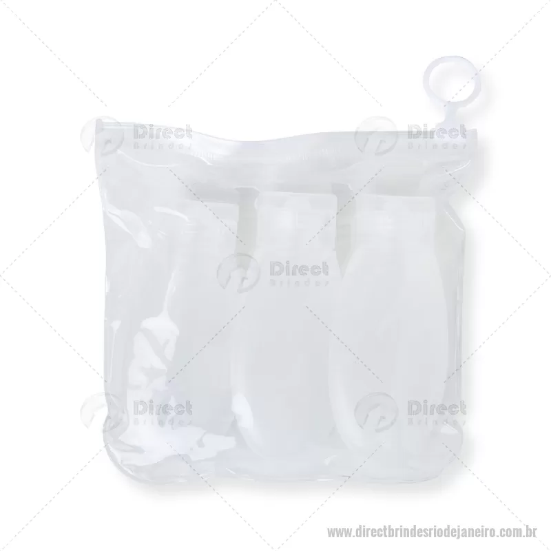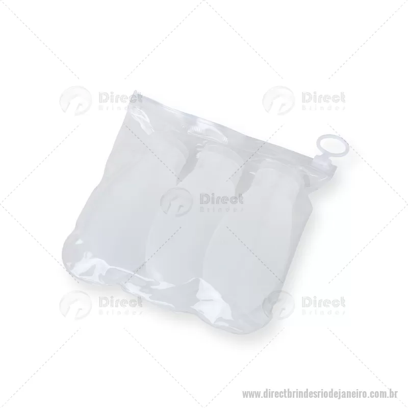 O kit viagem 3 Peças é a escolha perfeita para quem busca praticidade e organização durante as viagens. O conjunto inclui três frascos plásticos de 60ml, ideais para transportar líquidos e produtos de higiene pessoal, respeitando as normas de segurança para viagens aéreas. O estojo de PVC com ziplock mantém os itens organizados e seguros, além de evitar que a umidade espalhe para a área externa, caso os itens estejam molhados. Estojo: Altura : 14,9 cm x Largura : 15,1 cm Tamanho total aproximado (CxL): Frasco 10,7 cm x 5,1 cm Peso aproximado (g): 50 - - DRTJJKVG018