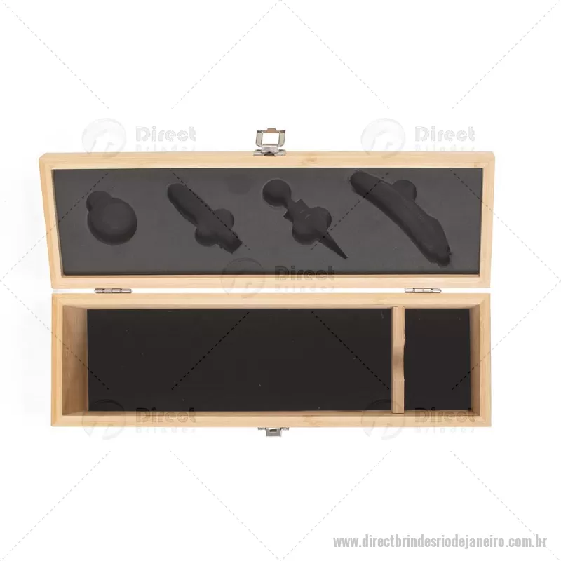 Kit Vinho em bambu com interior em EVA e fecho em inox, suporte para garrafa de vinho de 750 ml (padrão). Contém: saca-rolha de metal com detalhes em bambu e cortador de lacre, anel corta-gotas de metal, bico para servir de metal com tampa em bambu e tampa de metal com detalhe em bambu. Peso do Produto: 0,997kg Dimensão do Produto: 11x36x11cm *Não acompanha garrafa vinho, imagem meramente ilustrativa. - - DRTJJKVI051