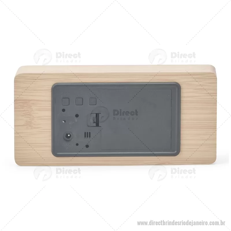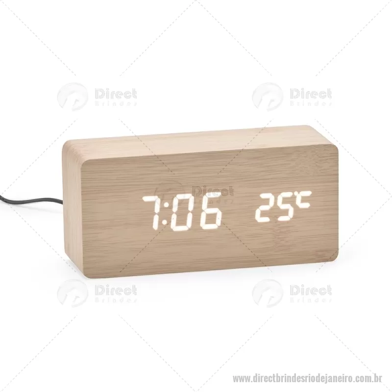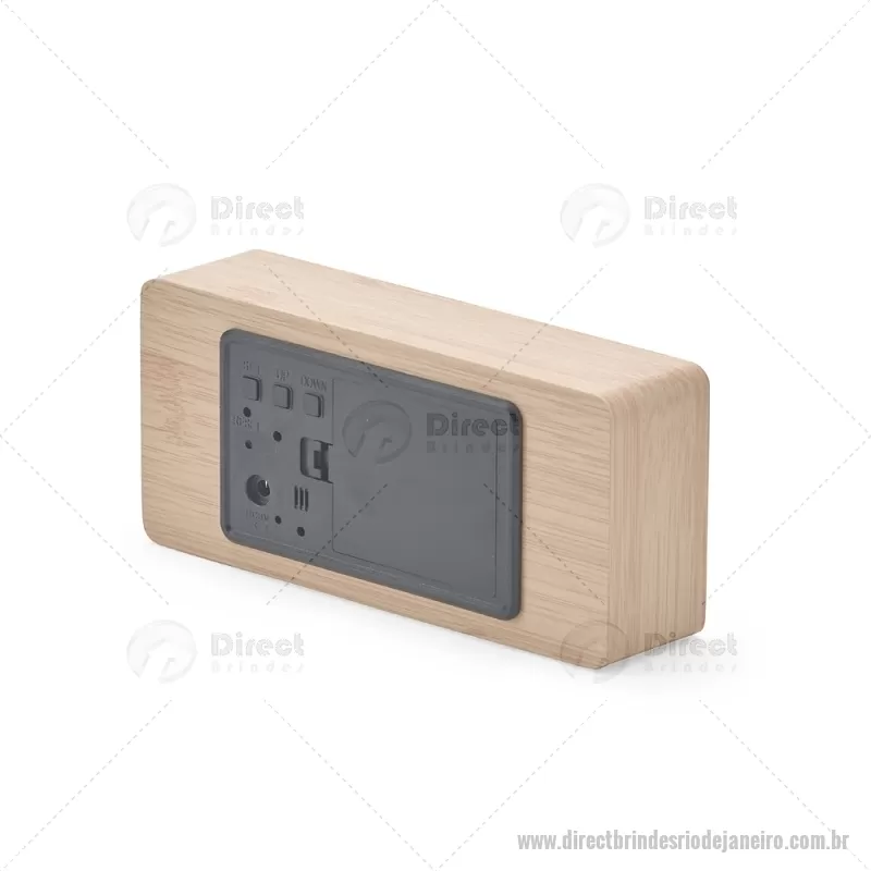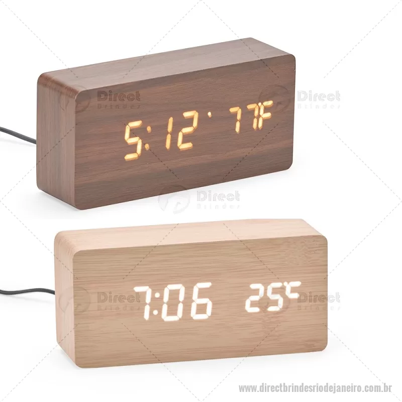 Relógio despertador em madeira com display LED, que combina design elegante e tecnologia moderna. Exibe horas, data e temperatura ambiente, além de permitir a programação de até três alarmes com diferentes configurações. Pode ser alimentado por 4 pilhas AAA (não inclusas) ou por cabo USB DC 5V, que acompanha o produto, oferecendo praticidade para o uso diário. - - DRTJJREL023