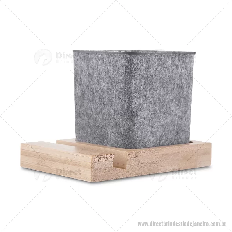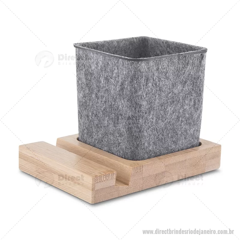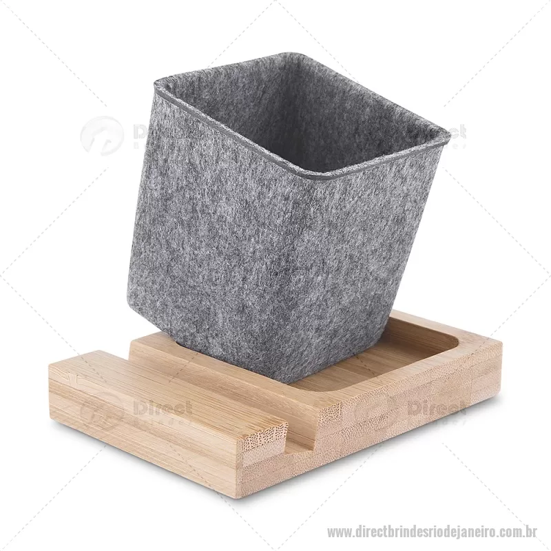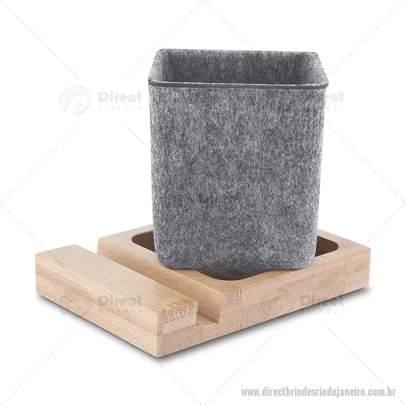 Porta objetos/smartphone em feltro e bambu Porta-objetos em feltro reciclado com suporte para celular em bambu. Prático e versátil, ideal para organizar canetas, lápis, marcadores e manter a mesa de escritório sempre funcional e elegante. Peso do Produto: 0,112kg Dimensão do Produto: (1,7x11,7x8,5cm) (Base em bambú) Dimensão do Produto: 8x6,5x6,5cm (Porta Caneta) - - DRTJJPC021